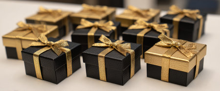 Small gift boxes in black and gold sit elegantly on a white table, each adorned with bows. They create a festive atmosphere for an upcoming celebration, inviting joy and excitement.