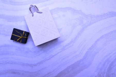 Trendy color of year 2022 Very Peri. Violet gift box on trendy color background. Trendy color background.