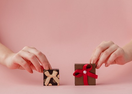 Small gift boxes in women's hands on a pink background. Festive concept for Valentine's day, Mother's day or birthday.
