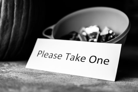 Bowl sitting on a doorway with a sign stating to please take one for Halloween trick or treaters.