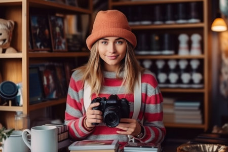 Beautiful young woman taking a photo with a vintage camera at home