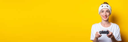 Young woman surprised in shock, in a white T-shirt and in a bandage on her head on a yellow background