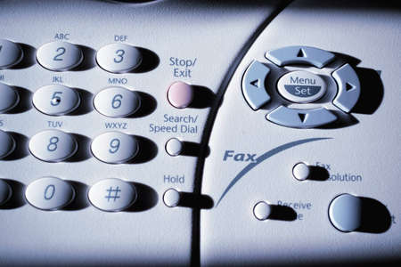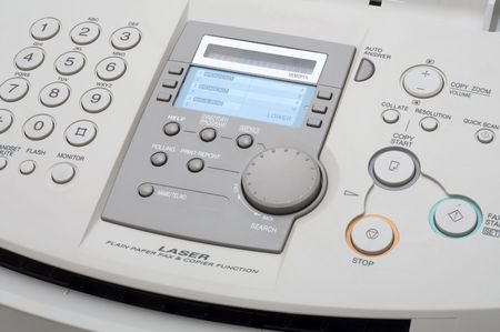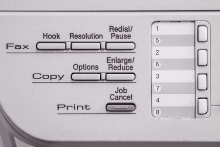 close up of Multifunction facsimile or fax keypad with yellow alarm light.