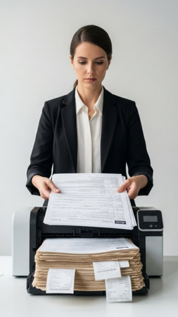 Businessman at a modern office printer, concentrating as he copies important documents.