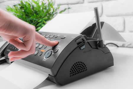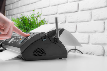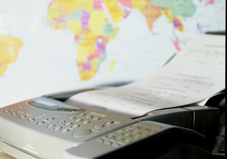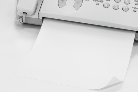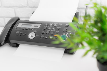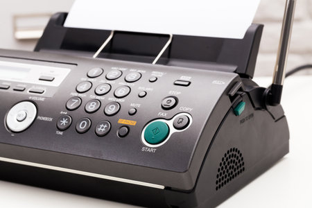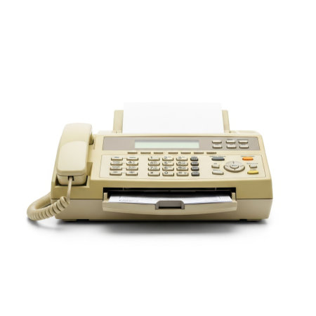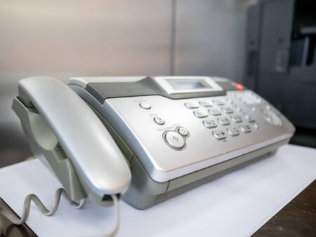 A close-up, eye-level view of a traditional beige fax machine. It features a connected handset, a paper output tray with a sheet partially extended, and a detailed keypad.