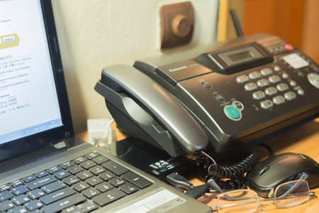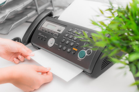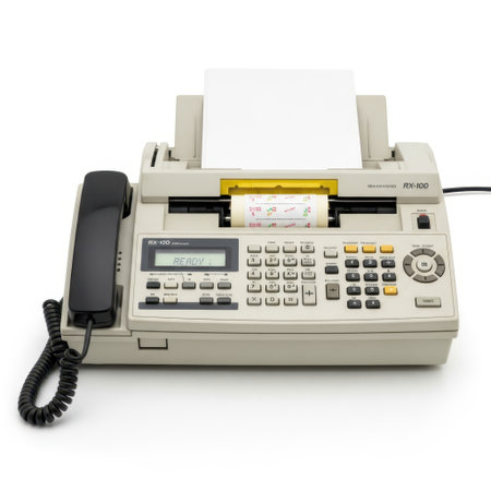 A vintage beige fax machine sits ready to transmit a document, its handset off the hook. This classic office device represents old-school communication methods.
