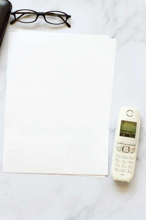 Telephone for customer service and blank white note paper with pen in hotel room.