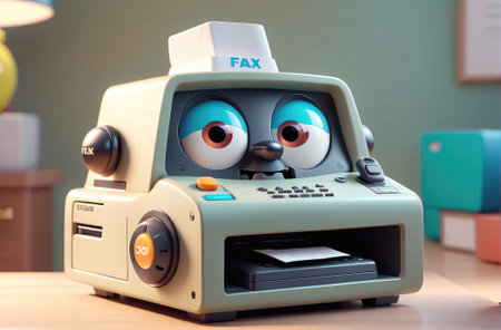 Cute Cartoon Fax Machine Character Happily Operating in a Bright Office Environment