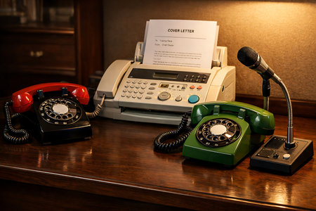 A nostalgic view of a traditional office desk featuring a classic red rotary dial telephone, a green rotary dial telephone, a retro fax machine with a 'Cover Letter' document, and a microphone on a stand. This image captures the essence of vintage communication technology and a bygone era of business and broadcasting.