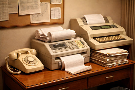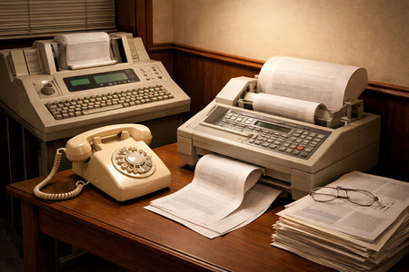 A nostalgic still life featuring old office technology, including two vintage fax machines, a classic rotary dial telephone, a stack of documents, and reading glasses, all arranged on a traditional wooden desk. The warm lighting enhances the retro ambiance, evoking a sense of past communication methods and outdated business environments.