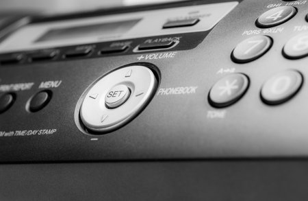 Closeup surface function of old photocopier and fax machine in the office textured background in black and white tone
