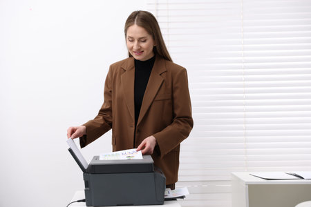 Vertical medium long shot of Asian female manager making copy of paper document with use of scanner in modern office