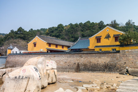 Building of Chinese buddhist temple in Mount Luojia, which lies in the Lotus Sea to the southeast of Putuo Mountain, Zhoushan, Zhejiang, the place where Bodhisattva Guanyin practiced Buddhism