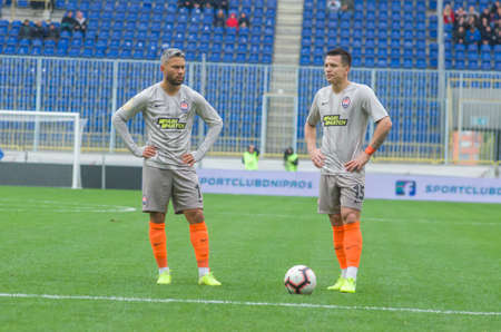 DNIPRO, UKRAINE - OCTOBER 6, 2019: FC Shakhtar players Eugene Konoplianka(R) and Marlos (L) in action during the Premier League football match SC Dnipro-1 against FC Shakhtar.
