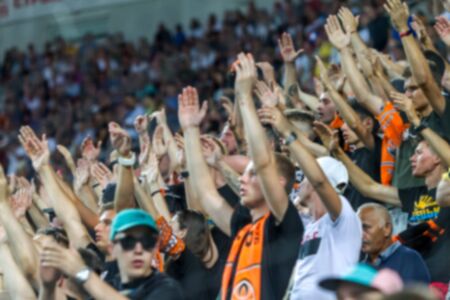 ODESSA UKRAINE - July 28, 2019: spectators at stadium. Crowds of fans in stands of football stadium during match Shakhtar (Donetsk) -Dynamo (Kiev). Grandstand with fans. Stands with football fans