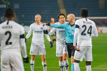 KHARKIV, UKRAINE - February 14, 2019: Eintracht Frankfurt players and referee during the UEFA Europa League match between Shakhtar vs Eintracht Frankfurt, Ukraine