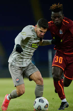 Kiev, Ukraine - December 12, 2016: Derlis Gonzalez of Dynamo Kyiv fighting for the ball with Dario Srna of Shakhtar during Ukrainian Premier League match at NSC Olimpiyskiy stadium.
