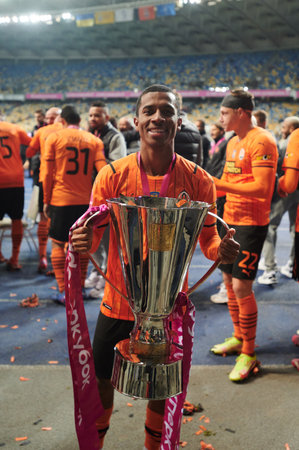 KYIV, UKRAINE - SEPTEMBER 22, 2021: Players winners of the football match of Ukrainian Super Cup FC Shakhtar vs FC Dynamo