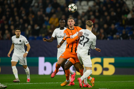 GELSENKIRCHEN, GERMANY - 6 NOVEMBER, 2024: Oleksandr Zubkov, Lewin Blum, The UEFA Champions League football match between FC Shakhtar Donetsk and BSC Young Boys at Veltins Arena