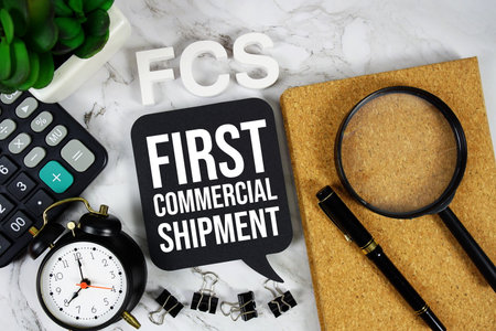 First Commercial Shipment acronym with calculator, alarm clock and magnifying glass, Business concept background