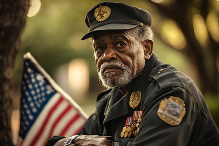 Portrait of a veteran in uniform, adorned with medals, sitting thoughtfully with the US flag nearby, Veterans, Memorial or Independence Day.