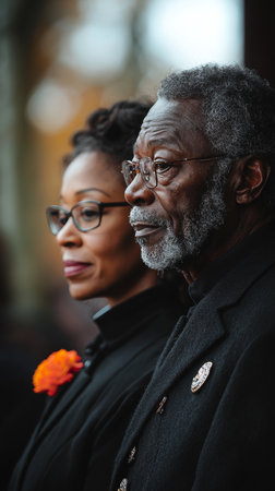 A thoughtful couple standing side by side at a funeral, reflecting deep emotions and love. The scene captures a moment of remembrance and connection amid sorrow.