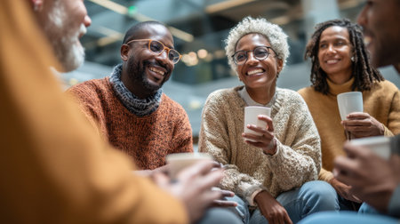 Engaging group of friends enjoying warm beverages in cozy setting, sharing laughter and conversation. atmosphere is friendly and inviting, perfect for connection and bonding