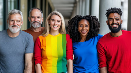 A group of people are smiling and posing for a photo. They are wearing colorful shirts and one of them is wearing a rainbow shirt. Scene is happy and cheerful. AI generated.