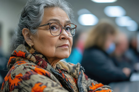 Candid photo of a senior patient from a minority background wearing a hat and glasses and talking with people. Generative Ai