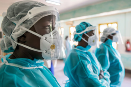 A group of healthcare workers in personal protective equipment prepares labonachip devices at a curbside testing site illustrating the collaborative effort in managing infectious diseas