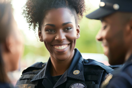 Police officer interacting with colleague.