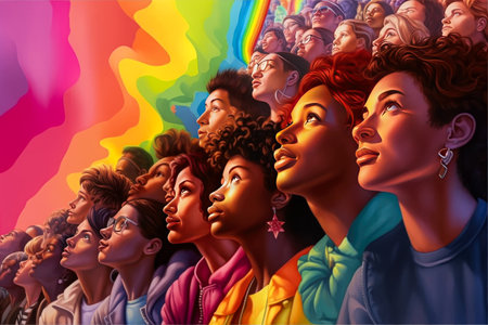 Pop art illustration, banner, texture or background depicting the pride day and the LGBT community with diverse people. Generative AI.