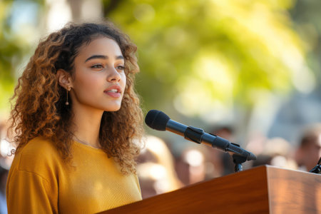 Young female politician addresses public from podium outdoors, embodying confidence, leadership, and modern civic engagement.