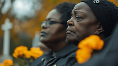 two african american women are attending a funeral service outdoors with orange flowers and a white cross