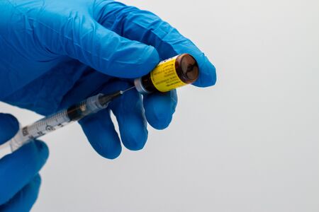 Flu shot. Hands in blue gloves prepare to give a shot on white background.