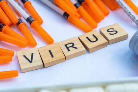 virus keyword on wood block with the equipment of hospital