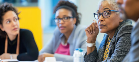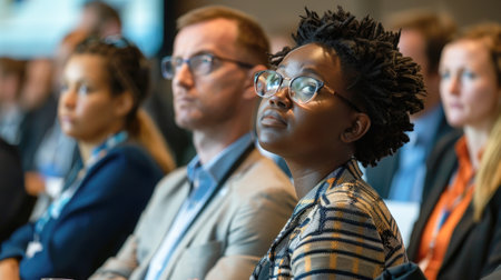 Focused businesswoman listening during a presentation, participating in a corporate training seminar