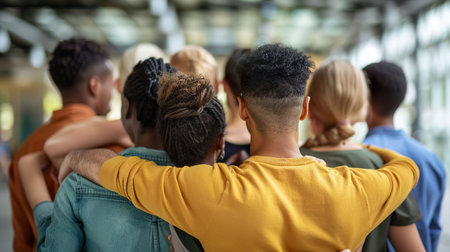 Generative AI : Multi ethnic young people team hugging together outside International community of students support and help each other Friendship team building and diversity con