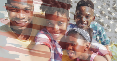 Image of usa flag over happy african american family. National patriotism concept digital generated image.