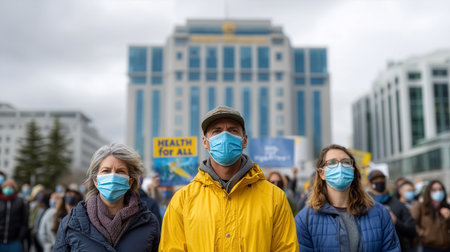 Crowd of individuals stands together at rally, focused on advocating for health and social equity. Urban backdrop features modern buildings and cloudy skies.