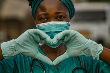 A female african medic nurse wearing a face mask, gloves, a blue green uniform showing the shape of a heart. Medical love, care, and safety symbol with Corona virus health protection symbol concept.
