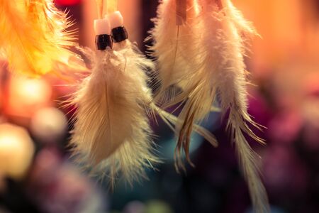 Plumage and beads of a Native American Dreamcatcher. Close up. Selective focus.