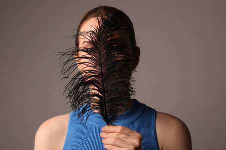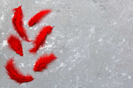 A row of fluffy tender pockmarked feathers and feather lies on a light gray modern background. The concept of lightness, airiness, tenderness, boho style. Greeting card with feather.