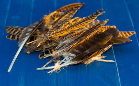 background of brightly colored dyed bird feathers on Colored background, top view. copyspace.