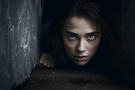 Emotions feelings psychology adrenaline concept. Nervous lady expressing fear. Young scared girl intimidated feeling endangered threatened intimidated.