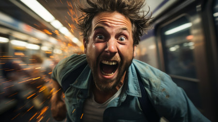 a man is running through a subway station with his mouth wide open