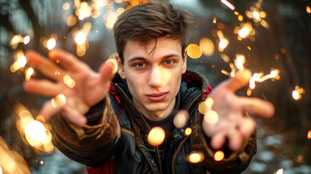 Portrait of a young man with sparklers in his hands.