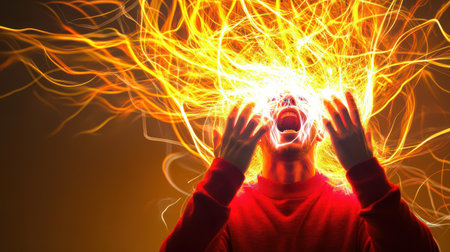 A person expresses intense emotion with vibrant energy flowing from their head illuminated in a glowing orange yellow hue against a dark background.