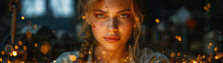 Female blacksmith forging metal, sparks flying, traditional craft, modern woman.