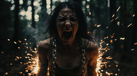 A woman with a chain around her neck is screaming in a forest. The scene is dark and eerie, with the woman's face twisted in a terrifying expression
